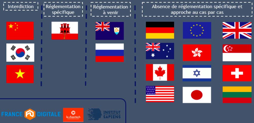 Les réglementations sur les ICO dans le monde sont encore balbutiantes et chaque pays expérimente sa propre voie, comme le montre le schéma suivant.